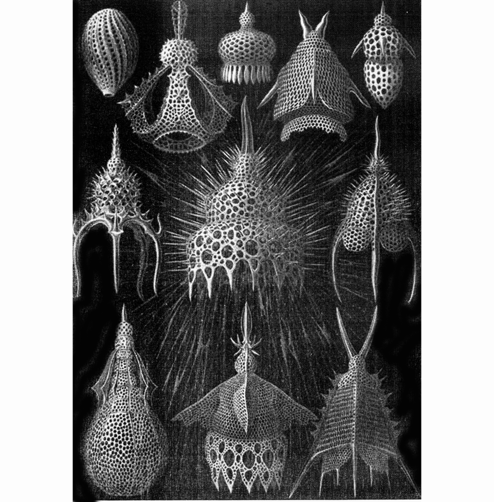 La leçon portait sur les Radiolaires. Aujourd’hui, il suffit d’ouvrir internet et cliquer sur « radiolaires » pour lire « Les Radiolaires (Radiolaria ou Radiozoa)  font partie du zooplancton ou plancton animal. Ces organismes dont la taille est comprise entre 50 et 300 µm sont des Eucaryotes (2) unicellulaires ». Ce sont donc des microorganismes entourés d’une coque siliceuse, et voici qu’apparaissent sous nos yeux émerveillés – je parle des miens – une incroyable dentelle vivante d’une grande finesse et d’une infinie variété.  Dans quel but le prof de mon premier cours de fac couvrait-il ainsi le mur de l’amphi de ces immenses formes fantasmagoriques ? Je fus soudain pris d’inquiétude, faudra-t-il les retenir ? Certainement pas, c’eût été impossible, mais alors pourquoi ? Pour nous faire connaître l’extraordinaire diversité du monde vivant ? Sans doute ; en ce qui me concerne, il avait réussi, mon émerveillement était au comble.